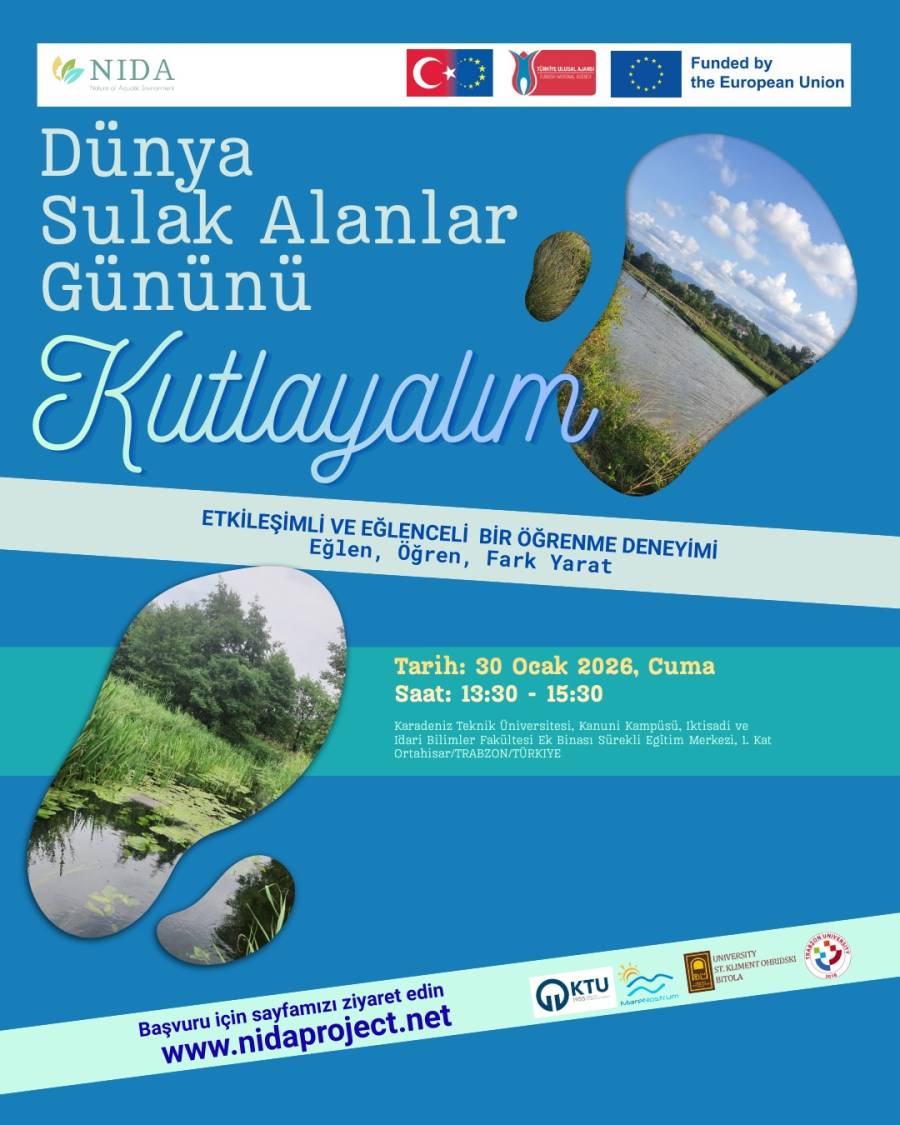 Karadeniz Teknik Üniversitesi Koordinatörlüğünde ve Prof. Dr. Ertan DÜZGÜNEŞ'in araştırmacı olarak yer aldığı ERASMUS+ KA220 HED projesi kapsamında Sulak Alanlar Günü etkinliği gerçekleştirilecektir. Lisans ve lisansüstü öğrencilerine yönelik etkinlikte drama odaklı faaliyetlerle eğlence odaklı öğrenme deneyimi sağlanacaktır. 30 Ocak 2026 tarihinde saat 13.30'de İktisadi ve İdari Bilimler Fakültesi Ek Binası Sürekli Eğitim Merkezi 1. Kat'ta yapılacak etkinlik için kontenjanlar sınırlı olup www.nidaproject.net web sitesinden başvurular alınmaktadır.