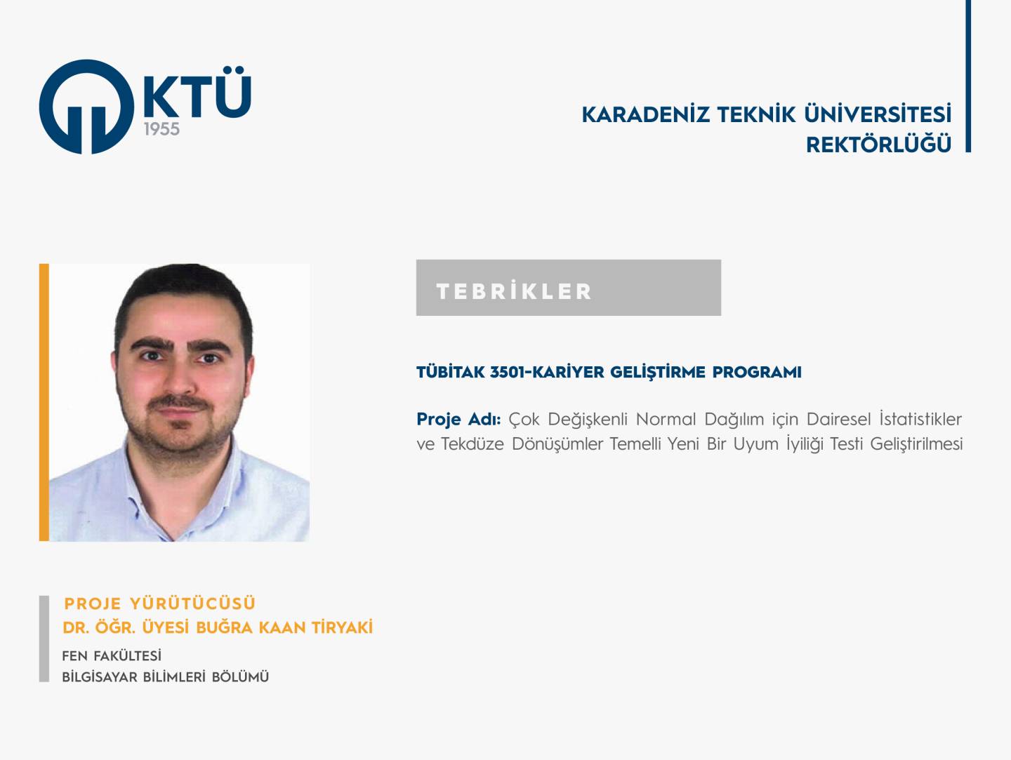 Üniversitemiz Fen Fakültesi Bilgisayar Bilimleri Bölümü Öğretim Üyelerinden Dr. Öğr. Üyesi Buğra Kaan TİRYAKİ’nin “Çok Değişkenli Normal Dağılım için Dairesel İstatistikler Ve Tekdüze Dönüşümler Temelli Yeni Bir Uyum İyiliği Testi Geliştirilmesi” başlıklı projesi, “TÜBİTAK 3501-Kariyer Geliştirme Programı” kapsamında desteklendi.