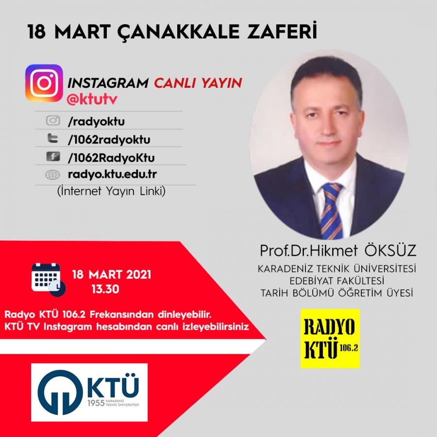 "Çanakkale Zaferi Türk askerinin ruh kudretini gösteren şayanı hayret tebrik bir misaldir. Emin olmalısınız ki Çanakkale Muharebelerini kazandıran bu yüksek ruhtur." Gazi Mustafa Kemal Atatürk. 18 Mart Perşembe günü Çanakkale Zaferinin yıldönümü kutladığımız bu kutlu günde Radyo KTÜ ve KTÜ TV'nin konuğu Karadeniz Teknik Üniversitesi Edebiyat Fakültesi Tarih Bölümü Öğretim Üyesi Prof.Dr.Hikmet ÖKSÜZ olacaktır. Radyo KTÜ 106.2 Frekansından, radyo.ktu.edu.tr internet adresinden dinleyebilir @ktutv Instagram adresinden canlı izleyebilirsiniz.