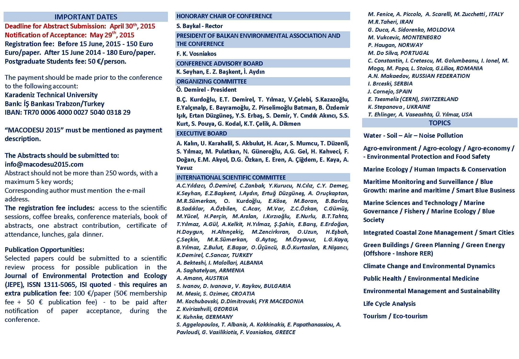 Balkan Çevre Birliği (Balkan Environmental Association/BENA) ve Karadeniz Teknik Üniversitesi (Deniz Bilimleri ve Orman Fakülteleri'nin katılımıyla) ile Trabzon Su Ürünleri Merkez Araştırma Enstitüsü Müdürlüğü'nün işbirliğinde ortaklaşa 18-20 Eylül 2015 tarihleri arasında düzenlenen "1st International Conference on Sea and Coastal Development in the Frame of Sustainability" (Macodesu2015)"/ Sürdürülebilirlik Kapsamında Deniz ve Kıyı Gelişimi 1.Uluslararası Konferansı, KTÜ Kanuni Kampüsünde Osman Turan Kongre ve Kültür Merkezi'nde yapılacaktır.