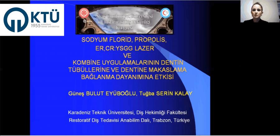 Üniversitemiz Diş Hekimliği Fakültesi Klinik Bilimler Bölümü Restoratif Diş Tedavisi Anabilim Dalı'ndan, Dr. Öğr. Üyesi Güneş BULUT EYÜBOĞLU ve Dr. Öğr. Üyesi Tuğba SERİN KALAY, "Sodyum Florid, Propolis, ER,CR:YSGG Lazer ve Kombine Uygulamalarının Dentin Tübüllerine ve Dentine Makaslama Bağlanma Dayanımına Etkisi" adlı çalışmaları ile 23-25 Kasım 2021 tarihlerinde, Sivas Cumhuriyet Üniversitesi'nde düzenlenen 1. Uluslararası Diş Hekimliği Kongresi'nde, Sözlü Bildiri Dalı'nda Birincilik Ödülü'ne layık görüldü.