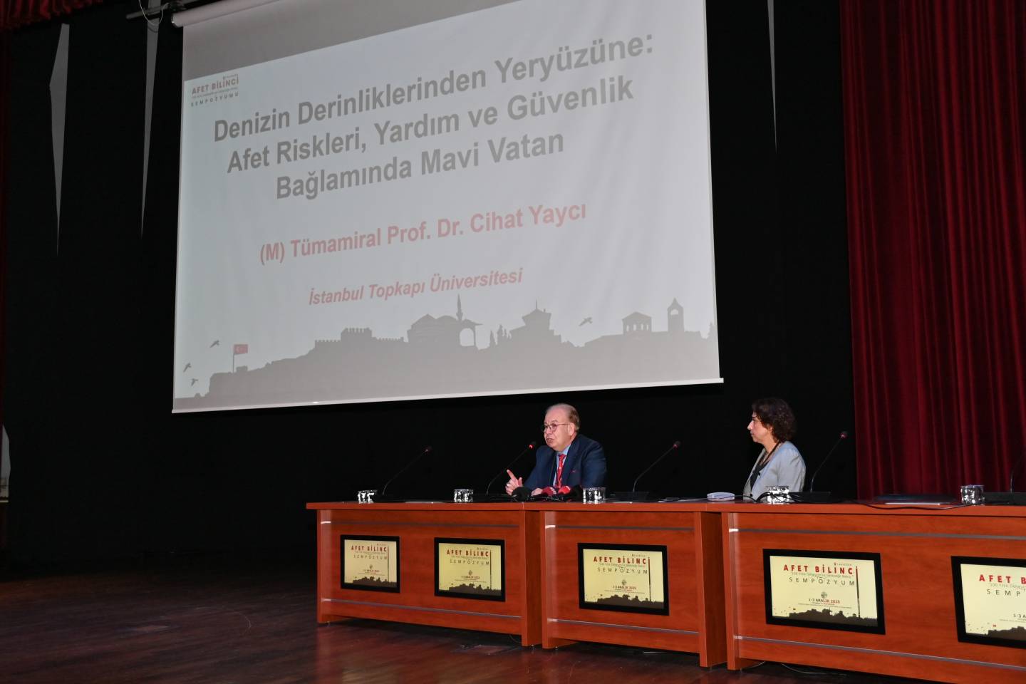 Açılış konuşmalarının ardından davetli konuşmacı Emekli Tümamiral Prof. Dr. Cihat YAYCI, “Denizin Derinliklerinden Yeryüzüne: Mavi Vatan” başlıklı sunumunda afet riskleri, bölgesel güvenlik ve müdahale stratejilerini jeopolitik bir perspektifle değerlendirdi.