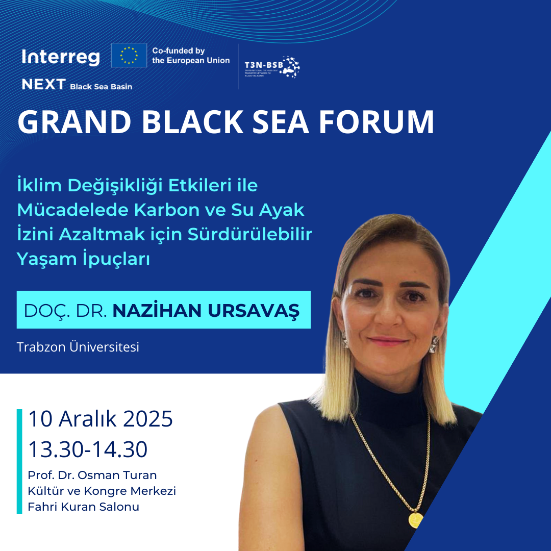 Doç. Dr. Nazihan URSAVAŞ, "İklim Değişikliği Etkileri ile Mücadelede Karbon ve Su Ayak İzini Azaltmak için Sürdürülebilir Yaşam İpuçları" konulu semineriyle Büyük Karadeniz Forumu'nda katılımcılara bilgi ve deneyimlerini aktaracak.