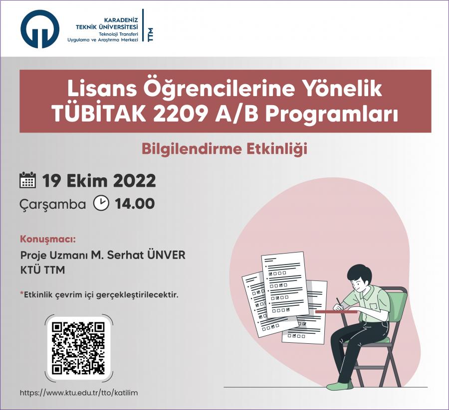 KTÜ TTM organizasyonuyla; Lisans Öğrencilerine Yönelik TÜBİTAK 2209 A/B Programları’nı tanıtmak ve öğrencilerimizin sorularını yanıtlamak amacıyla 19 Ekim 2022 Çarşamba Günü Saat: 14.00’da bir bilgilendirme etkinliği gerçekleştirilecektir.