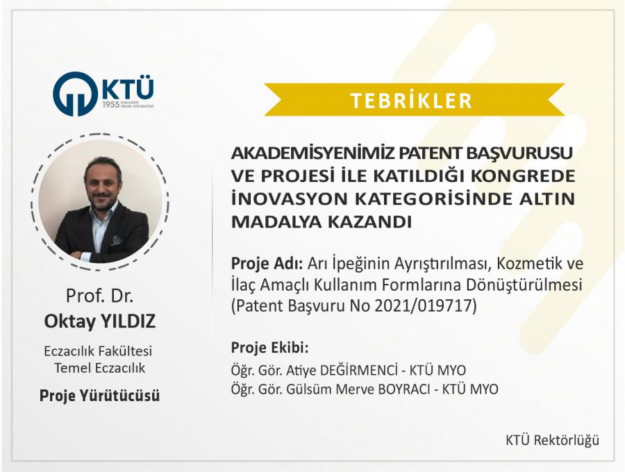 Üniversitemiz Eczacılık Fakültesi öğretim üyelerinden Prof. Dr. Oktay YILDIZ 7. Uluslararası Muğla Arıcılık ve Çam Balı Kongresi’nde ‘İnovasyon’ kategorisinde, Üniversitemiz Teknoloji Transferi Uygulama ve Araştırma Merkezi ile hem ulusal hem de uluslararası patent başvurusu yapılmış olan Arı İpeğinin Ayrıştırılması, Kozmetik ve İlaç Amaçlı Kullanım Formlarına Dönüştürülmesi' isimli projesiyle Altın Madalya Ödülü’ne layık görülmüştür.