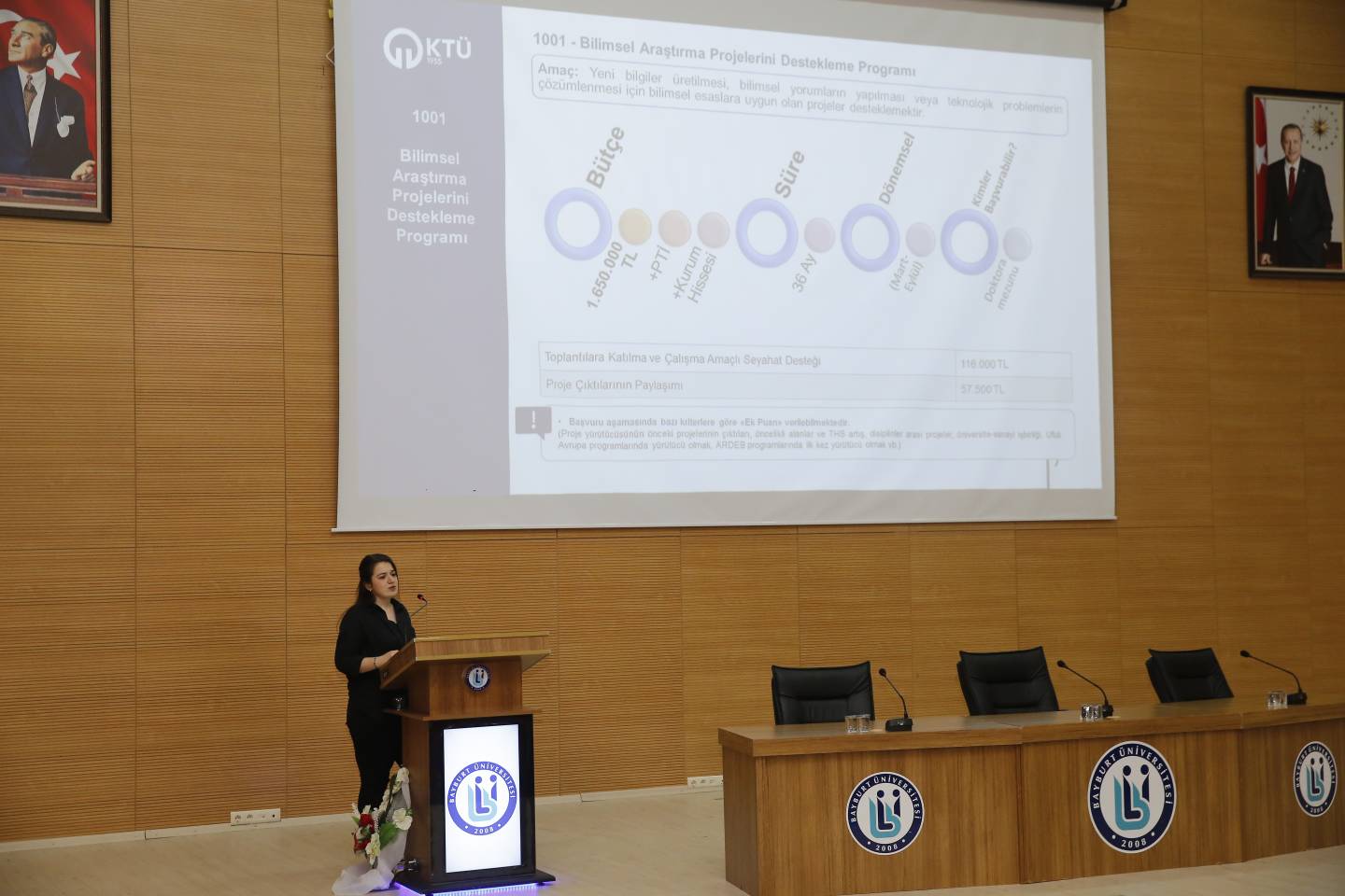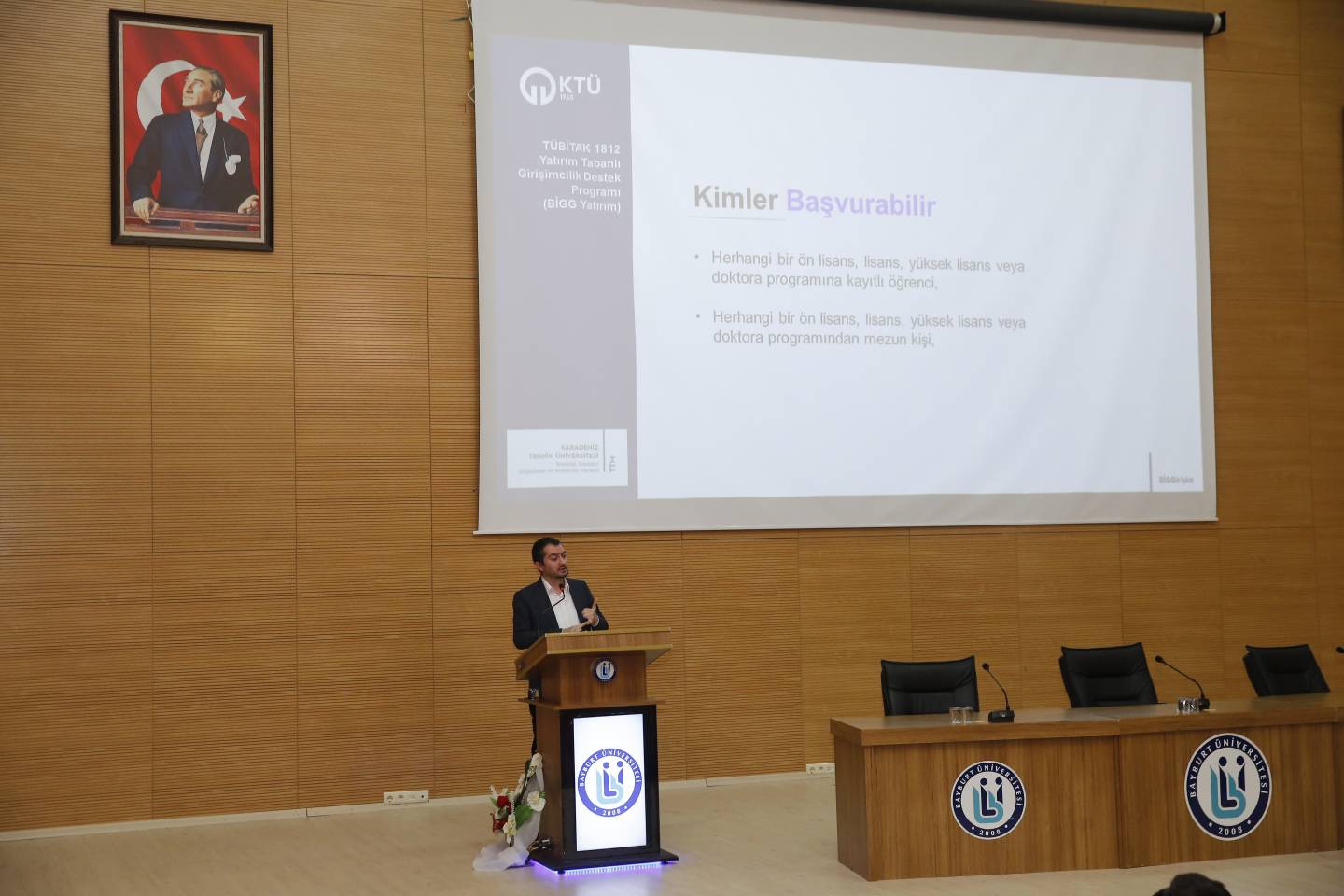 KTÜ TTM Müdürü Prof. Dr. Oktay YILDIZ ve Bayburt Üniversitesi TTO Müdürü Prof. Dr. Ali Savaş BÜLBÜL'ün açılış konuşmasıyla başlayan bilgilendirme etkinliği; KTÜ TTM’den Öğr. Gör. Gözde SAĞLAM, Öğr. Gör. İslam YILDIZ, Proje Uzmanı Eren YILMAZ ve Öğr. Gör. Kerim SÖNMEZ'in TÜBİTAK Araştırma Destek Programları, COST Programı, Girişimcilik ve Patent süreçleri hakkındaki sunumları ile devam etmiştir.