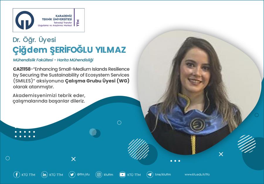 Üniversitemiz Mühendislik Fakültesi Harita Mühendisliği Bölümü öğretim üyesi Dr. Öğr. Üyesi Çiğdem ŞERİFOĞLU YILMAZ, COST Programı’nın “CA21158 - Enhancing Small-Medium Islands Resilience by Securing the Sustainability of Ecosystem Services (SMILES)” aksiyonuna Çalışma Grubu Üyesi (WG) olarak atanmıştır.