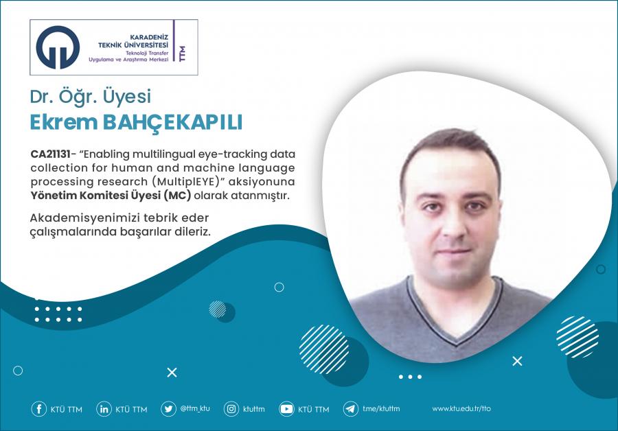 Üniversitemiz İktisadi ve İdari Bilimler Fakültesi Yönetim Bilişim Sistemleri öğretim üyesi Dr. Öğr. Üyesi Ekrem BAHÇEKAPILI, COST Programı’nın “CA21131 - Enabling multilingual eye-tracking data collection for human and machine language processing research (MultiplEYE) aksiyonuna Yönetim Komitesi Üyesi (MC) olarak atanmıştır.