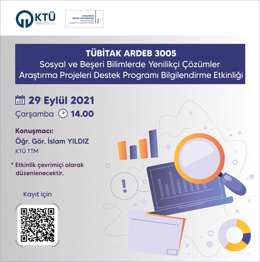 KTÜ TTM organizasyonuyla; TÜBİTAK ARDEB 3005-Sosyal ve Beşeri Bilimlerde Yenilikçi Çözümler Araştırma Projeleri Destek Programını tanıtmak, araştırmacılarımızın sorularını yanıtlamak ve ihtiyaç duydukları destek türlerine dair görüş alışverişinde bulunmak amacıyla 29 Eylül 2021 Çarşamba Günü Saat: 14.00’da Üniversitemiz araştırmacılarına bir bilgilendirme sunumu gerçekleştirilecektir.