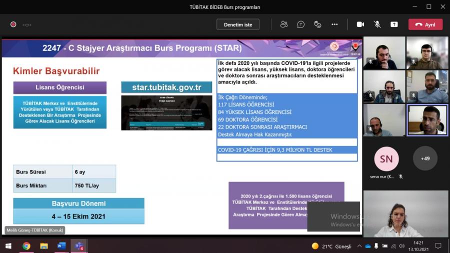 Üniversitemiz lisans ve lisansüstü öğrencileri ile doktora sonrası araştırmacılara yönelik TÜBİTAK Bilim İnsanı Destekleme Daire Başkanlığı (BİDEB) Burs programları hakkında çevrimiçi bilgilendirme etkinliği düzenlendi. Etkinlik, TÜBİTAK BİDEB Uzmanı Melih GÜNEŞ’in burs programları sunumunun ardından soru cevap ile tamamlandı.