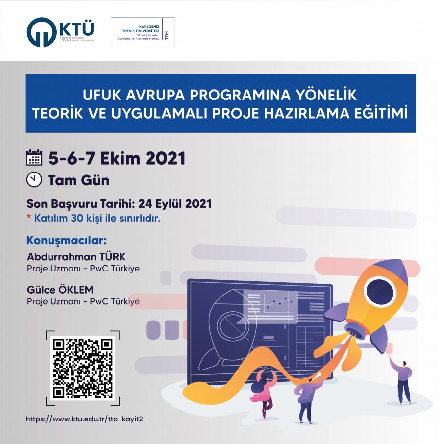 5-6-7 Ekim 2021 tarihinde KTÜ TTM konferans salonunda Ufuk Avrupa Programı özelinde (Çok Ortaklı Tematik Çağrılar Odaklı) teorik ve uygulamalı olmak üzere “Uluslararası Proje Hazırlama Eğitimi” gerçekleştirilecektir.