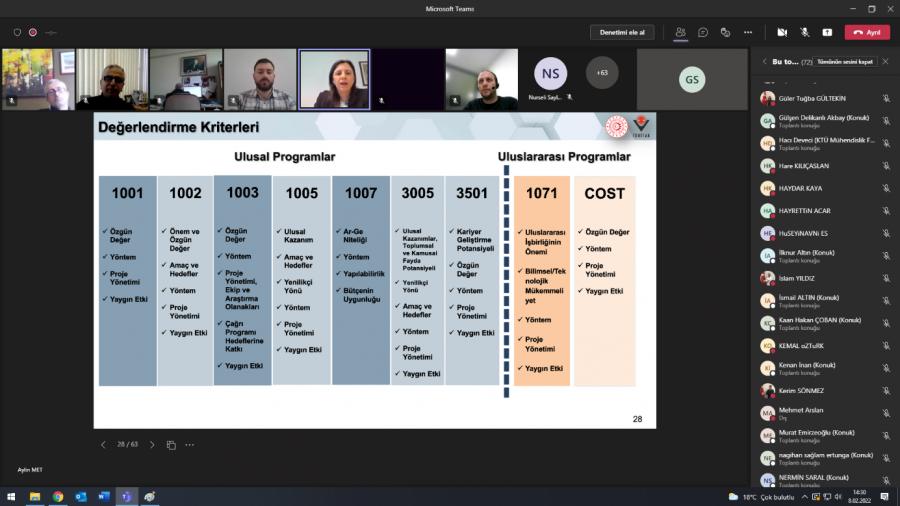 KTÜ TTM ve TÜBİTAK işbirliğiyle Üniversitemiz akademisyenlerine yönelik TÜBİTAK Araştırma Destek Programları Başkanlığı (ARDEB) programları kapsamında yapılan değişiklikler ve programın genel tanıtımı ile ilgili, TÜBİTAK ÇAYDAG Grup Koordinatörü Dr. Aylin MET’in katılımıyla çevrimiçi "TÜBİTAK ARDEB Programları Bilgilendirme Etkinliği" düzenlenmiştir.