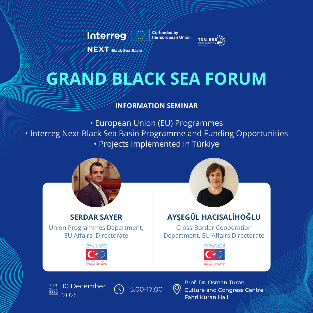 Experts Serdar SAYER and Ayşegül HACISALİHOĞLU from the European Union Directorate of the Ministry of Foreign Affairs of the Republic of Turkey will share their knowledge and experience with participants at the Black Sea Forum through seminars on “EU Union Programs, Interreg Next Black Sea Basin Program and Funding Opportunities, Projects Implemented in Türkiye.”