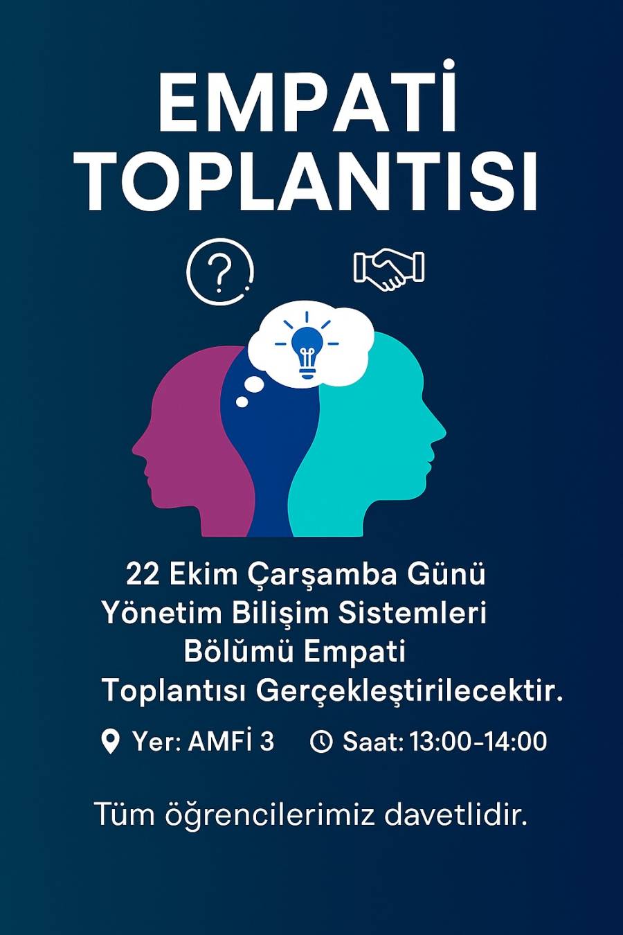 22 Ekim Çarşamba günü saat 13.00-14.00 arasında, AMFI 3 te Yönetim Bilişim Sistemleri Bölümü empati toplantısı gerçekleştirilecektir. Tüm öğrencilerimiz davetlidir.