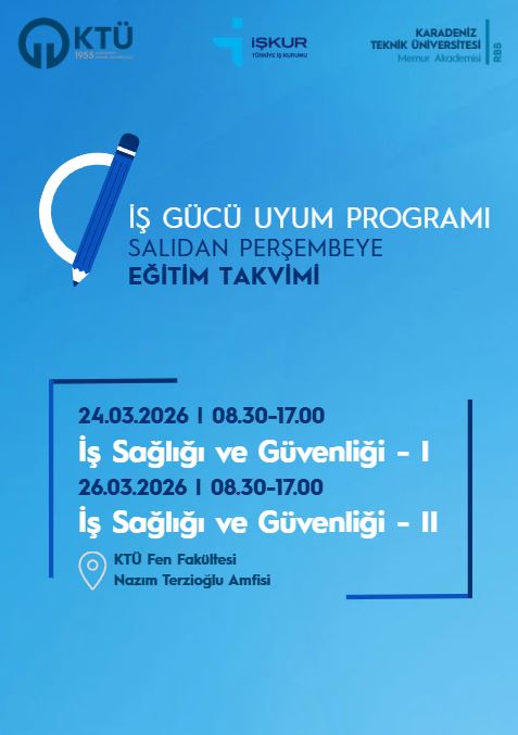 Eğitim programı kapsamında, Karadeniz Teknik Üniversitesi İşyeri Sağlık ve Güvenlik Birimi Koordinatörü Öğr. Gör. Gülten KURT tarafından "İş Sağlığı ve Güvenliği – I" eğitimi 23.03.2026 tarihinde; Karadeniz Teknik Üniversitesi Adli Bilimler Enstitüsü Müdür Yardımcısı Öğr. Gör. Ufuk DOĞRU tarafından "İş Sağlığı ve Güvenliği – II" eğitimi ise 26.03.2026 tarihinde, 08.30 – 17.00 saatleri arasında KTÜ Nazım Terzioğlu Amfisi’nde gerçekleştirilecektir.
