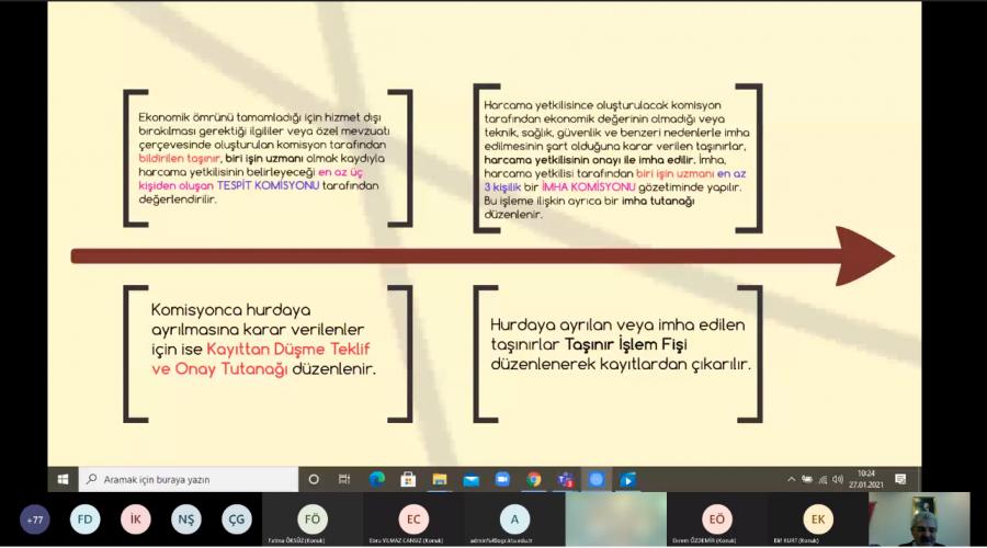 Resmi Yazışma Esasları ve Taşınır Mal Yönetmeliği eğitimini 27 Ocak 2021 Çarşamba günü saat 10.00'da Genel Sekreter Yardımcısı Fazlı ÖZTEL online olarak gerçekleştirdi. Eğitimin sonunda dinleyicilerin soruları cevaplandırıldı.