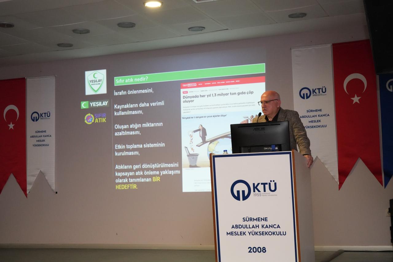 19.11.2025 tarihli ve 05 sayılı Birim Danışma Kurulu Dış paydaş toplantısında alınan karar gereğince, Sürmene Belediye Başkanlığı ile yapılan görüşme ile; KTÜ geneline çevre bilinci ve sürdürülebilirlik kapsamında, sıfır atık konusunda bilgilendirme amacıyla; Sürmene Belediye Başkan Yardımcısı Sayın: Zeki EFENDİOĞLU tarafından, Meslek Yüksekokulumuzda “Sıfır Atık” konusunda bilgilendirme konferansı düzenlendi.