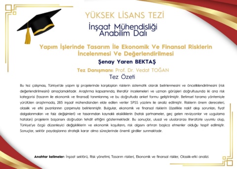 Anahtar kelimeler: İnşaat sektörü, Risk yönetimi, Tasarım riskleri, Ekonomik ve finansal riskler, Olasılık–etki analizi.