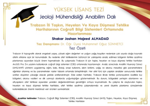Anahtar kelimeler: Trabzon, Coğrafi Bilgi Sistemleri (CBS), Analitik Hiyerarşi Süreci (AHS), Taşkın, Heyelan, Kaya Düşmesi,