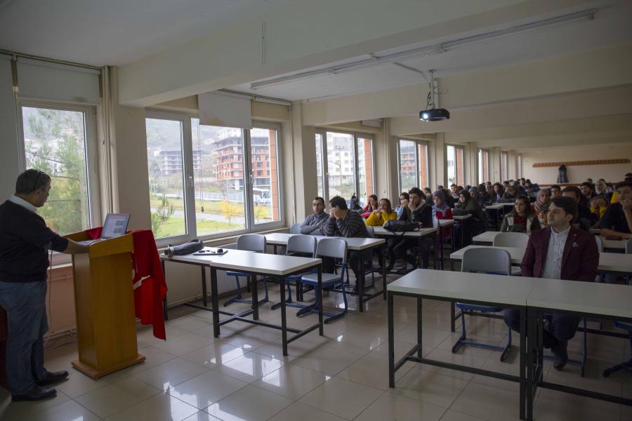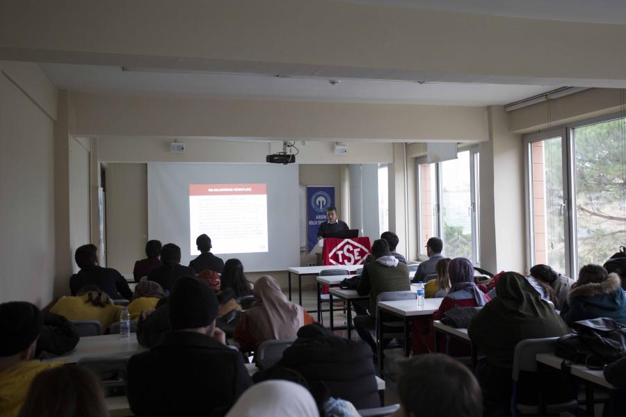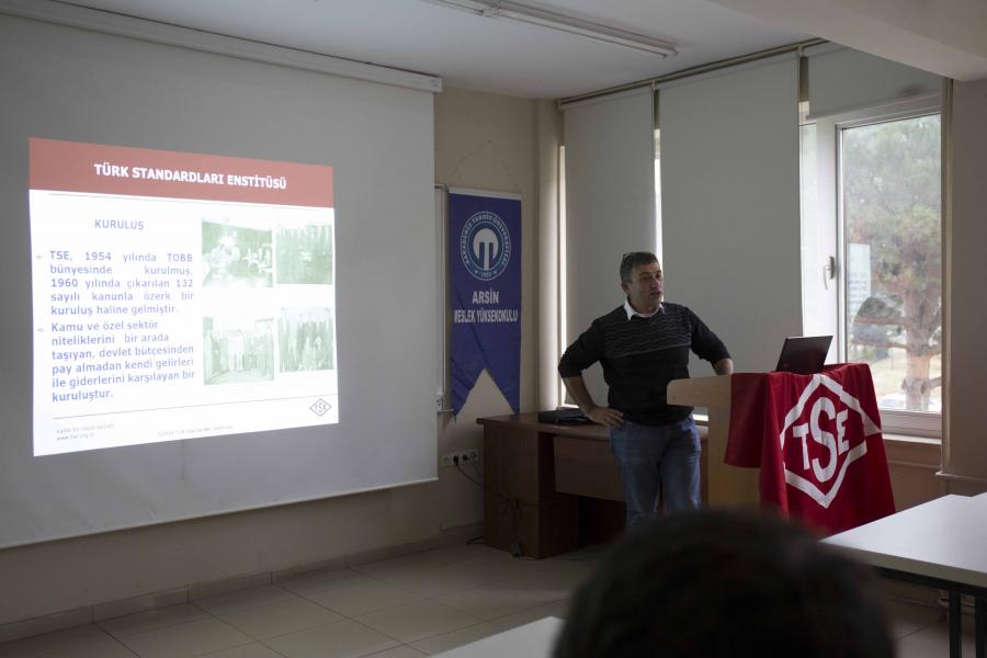 Meslek Yüksekokulumuzda 5 Aralık Perşembe günü  saat 14:00'de Türk Satndardları Enstitüsü (TSE) Trabzon Belgelendirme Müdürlüğü personeli (Uzman) Hüseyin GÜL'ün sunumuyla "Standardizasyon ve Ürün Güvenliği" konulu seminer düzenlendi. Arsin Meslek Yüksekokulu akademik personeli ve öğrencilerinin katılımıyla düzenlenen seminerde, TSE kurumsal tanıtım filmi gösteriminin ardından Hüseyin GÜL, standardizasyonun önemi, ürün güvenliği ve piyasa denetimleri hakkında detaylı bilgilendirmelerde bulundu. Seminer yaklaşık 80 kişinin katılımıyla gerçekleşti. Seminer programı soru-cevap bölümünün ardından MYO Müdür Yardımcısı Öğr. Gör. Dr. Hasan ÖZTÜRK'ün kapsamlı bilgilendirme ve sunumu için Hüseyin GÜL'e ve ilgili katılımcılara teşekkür konuşmasıyla sona erdi.