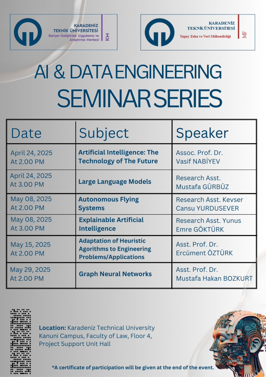 Our department's first Seminar Series program has been prepared. Seminars prepared by the faculty members of the Artificial Intelligence and Data Engineering Department on topics that appeal to different areas of interest will be held on the dates specified below. At the end of each seminar, participants will be given a participation certificate with the support of the Career Center.