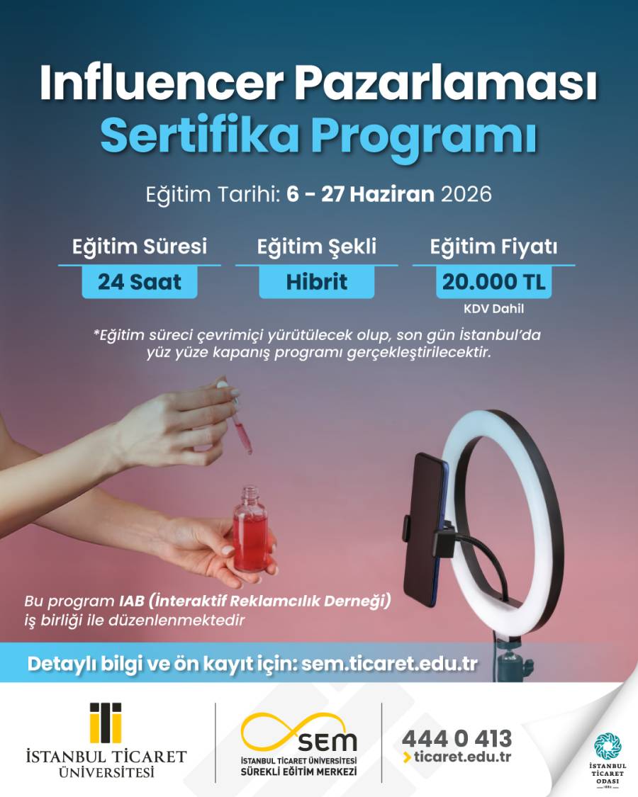 İstanbul Ticaret Üniversitesi Sürekli Eğitim Uygulama ve Araştırma Merkezi tarafından 06.06.2026 - 27.06.2026 tarihleri arasında hibrit olarak gerçekleştirilecek olan "Influencer Pazarlaması Sertifika Programı" için kayıtlar başlamıştır.