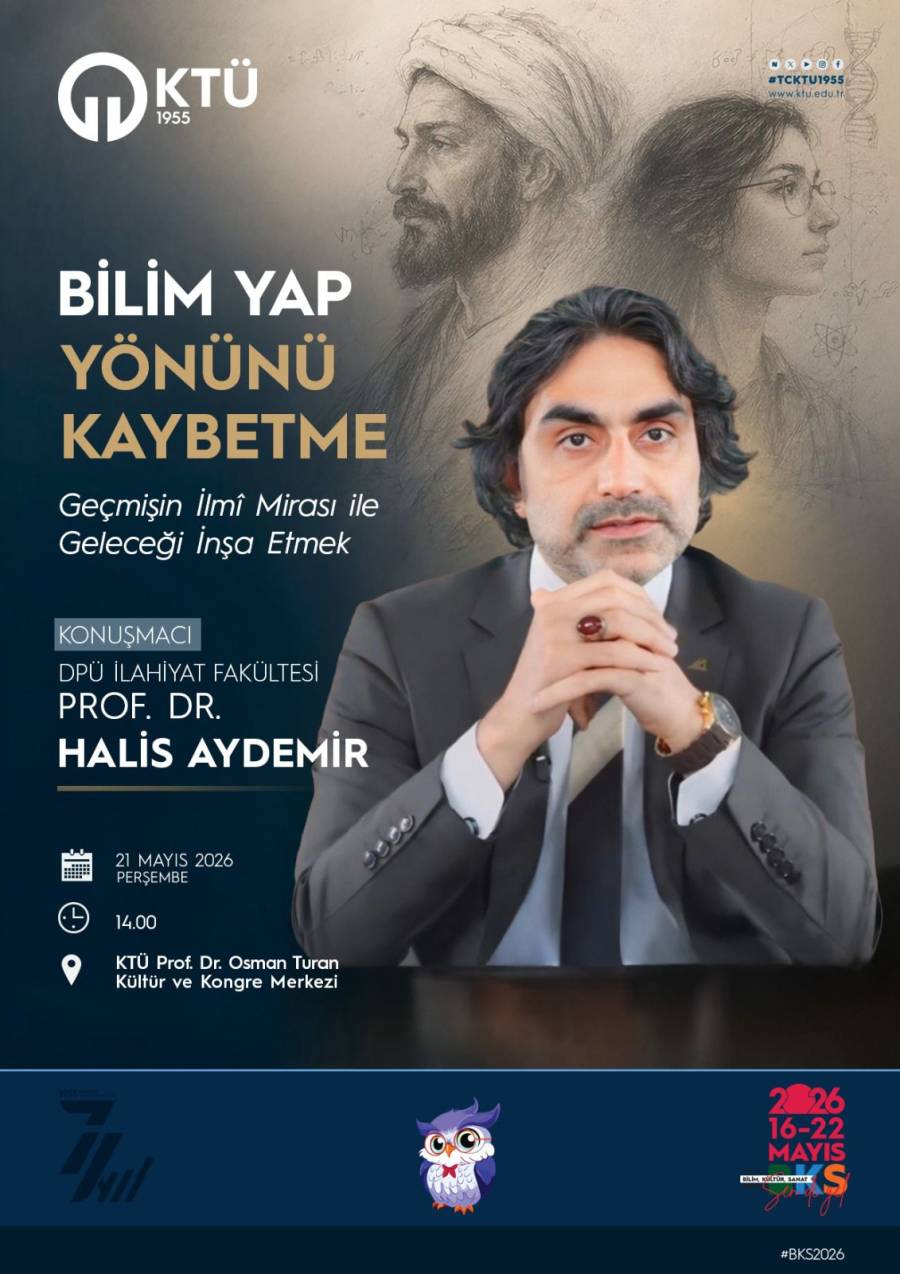 Dumlupınar Üniversitesi İlahiyat Fakültesi Öğretim Üyesi Prof. Dr. Halis Aydemir, “Bilim Yap, Yönünü Kaybetme: Geçmişin İlmî Mirası ile Geleceği İnşa Etmek” başlıklı konferansıyla Karadeniz Teknik Üniversitesi öğrencileriyle buluşuyor.
