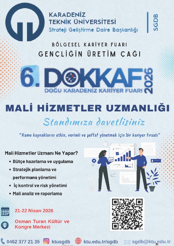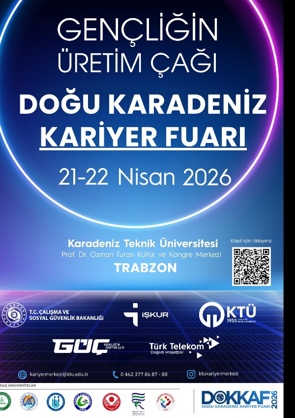DOKKAF 2026 Bölgesel Kariyer Fuarı, Çalışma ve Sosyal Güvenlik Bakanlığı İŞKUR Genel Müdürlüğü koordinasyonu ve KTÜ Kariyer Geliştirme Uygulama ve Araştırma Merkezi ev sahipliğinde gerçekleştirilecektir.