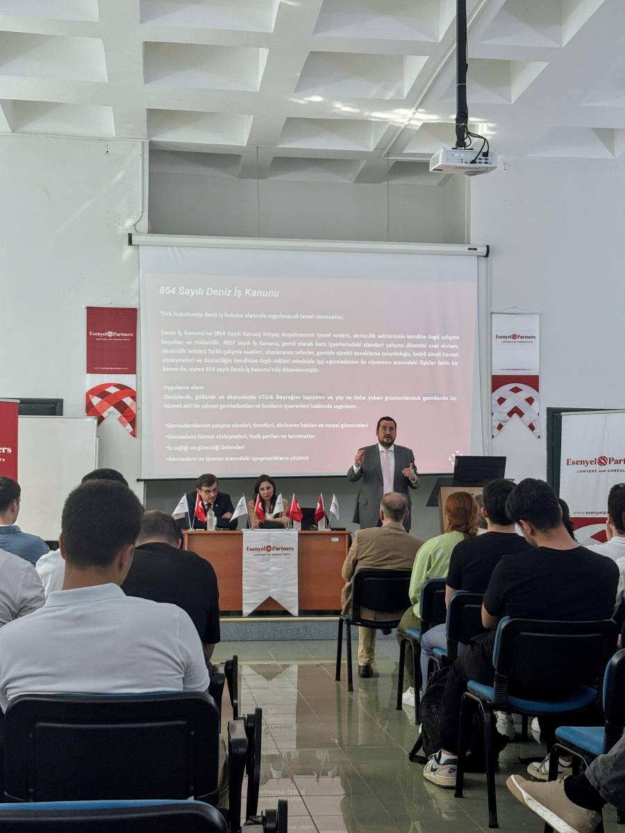 Karadeniz Teknik Üniversitesi Fen Bilimleri Enstitüsü Deniz Ulaştırma İşletme Mühendisliği Anabilim Dalı tarafından 23 Mayıs 2025 tarihinde Sahil Tesisleri Amfi Sınıfında düzenlenen “Deniz Ticaretinin Güncel Sorunları” seminerinde, konuşmacılar Esenyel Partners Avukatlık Bürosu, Av. Selçuk ESENYEL ve Av. Kpt. Cahit İSTİKBAL, denizcilik sektöründeki hukuki yapı üzerine kapsamlı ve değerli bilgiler paylaştılar. Seminerde özellikle Deniz İş Kanunu çerçevesinde hukuk kavramı, gemi adamlarının çalışma koşulları, sözleşme yapısı ve işverenle ilişkileri aktarılmış; sektörde sıkça karşılaşılan çatışma türleri örneklerle ele alınmıştır. Görev ve yetki karmaşaları, sözleşmeye aykırılık durumları, emir-komuta zincirindeki anlaşmazlıklar ile liman ve bayrak devleti uygulamalarından doğan hukuki çatışmalar; seminerin öne çıkan konuları arasında yer almıştır. Etkinlik, lisansüstü öğrencilerin denizcilik hukukuna ilişkin farkındalığını artıran verimli bir akademik buluşma niteliği taşımıştır.