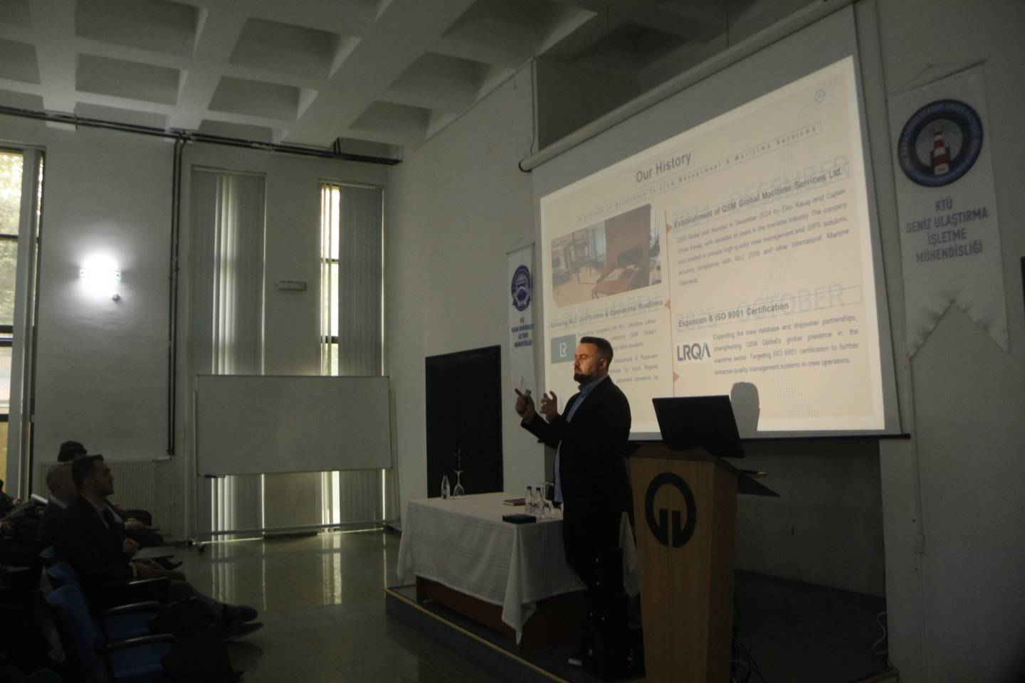 QSM Global kurucu ortaklarından Kaptan Orhan Kasap, denizcilik sektöründe kalite ve emniyet yönetim sistemleri, denetim süreçleri ve bu alandaki kariyer fırsatları hakkında bilgilendirmede bulundu. Program, soru–cevap bölümü ve plaket takdimi ile sona erdi.