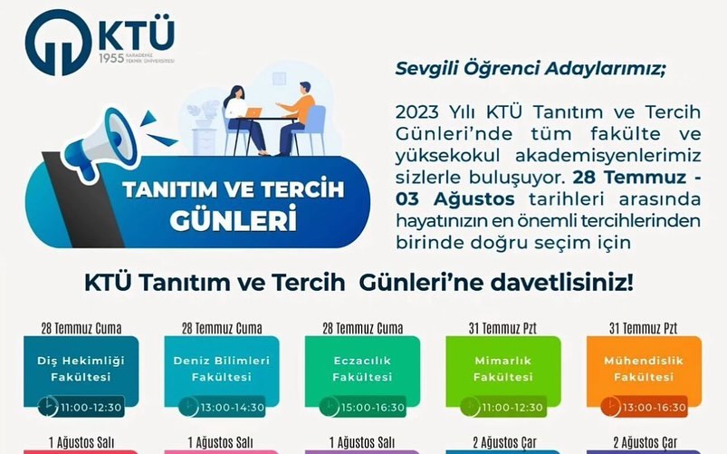 “KTÜ Tanıtım ve Tercih Günleri” kapsamında Fakültemizin tanıtımı ve 2023 Yükseköğretim Kurumları Sınavı (YKS) sonuçlarına göre tercih yapacak öğrenci adaylarına bilgilendirme yapıldı.