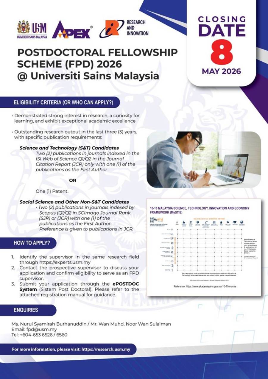Universiti Sains Malaysia (USM), 2026 yılı için Doktora Sonrası Araştırma Bursu Programı (Postdoctoral Fellowship Scheme – FPD) kapsamında başvuruları kabul etmektedir.
