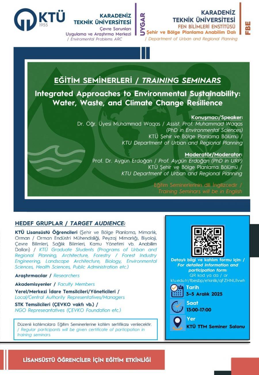Karadeniz Teknik Üniversitesi Şehir ve Bölge Planlama Bölümü tarafından düzenlenen lisansüstü öğrenciler için eğitim etkinliği "Integrated Approaches to Environmental Sustainability: Water, Waste, and Climate Change Resilience" temasıyla 03.12.2025-05.12.2025 tarihleri arasında KTÜ TTM Seminer Salonu'nda gerçekleştirilecektir. Seminer dili ingilizcedir. Düzenli katılımcılara eğitim seminerlerine katılım sertifikası verilecektir.