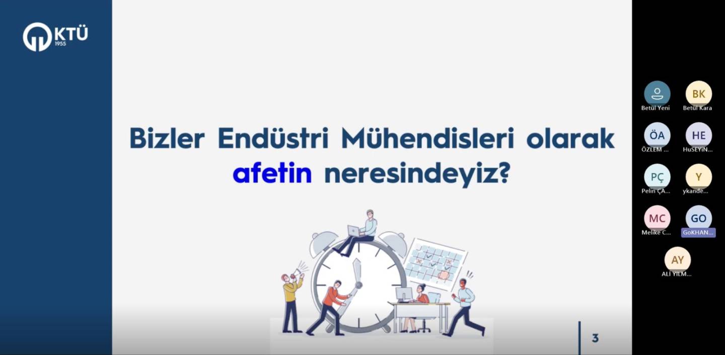 Doç. Dr. Özçelik ayrıca, afet yönetiminde endüstri mühendislerinin rolüne vurgu yaparak, karar destek sistemleri, matematiksel modelleme ve belirsizlik altında optimizasyonun bu alandaki kritik önemini örneklerle açıkladı. Sunumda, güncel araştırma eğilimleri, disiplinler arası çalışma olanakları ve gelecekte çalışılabilecek potansiyel araştırma alanları hakkında katılımcılarla görüş ve deneyimlerini paylaştı.