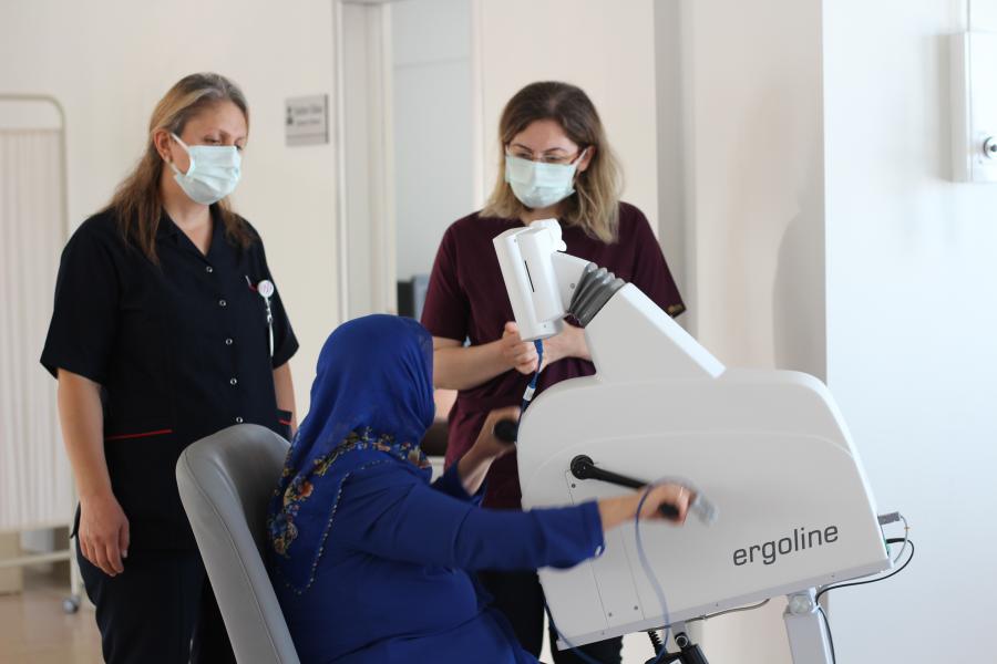 Hastanemize başvuran 57 yaşındaki Hatice DİNÇ, geçirmiş olduğu COVID-19 enfeksiyonundan sonra oksijen tüpüne bağımlı bir hayat sürdürmekte idi. COVID-19 enfeksiyonunu ağır geçirmiş olan hastamızın “pulmoner fibrozis” (akciğerlerdeki hava keseciklerinin (alveoller) duvarlarının kalınlaşıp sertleşmesi) dolayısıyla hastanemiz Kardiyopulmoner Rehabilitasyon Merkezimiz’de tedavisine başlandı.