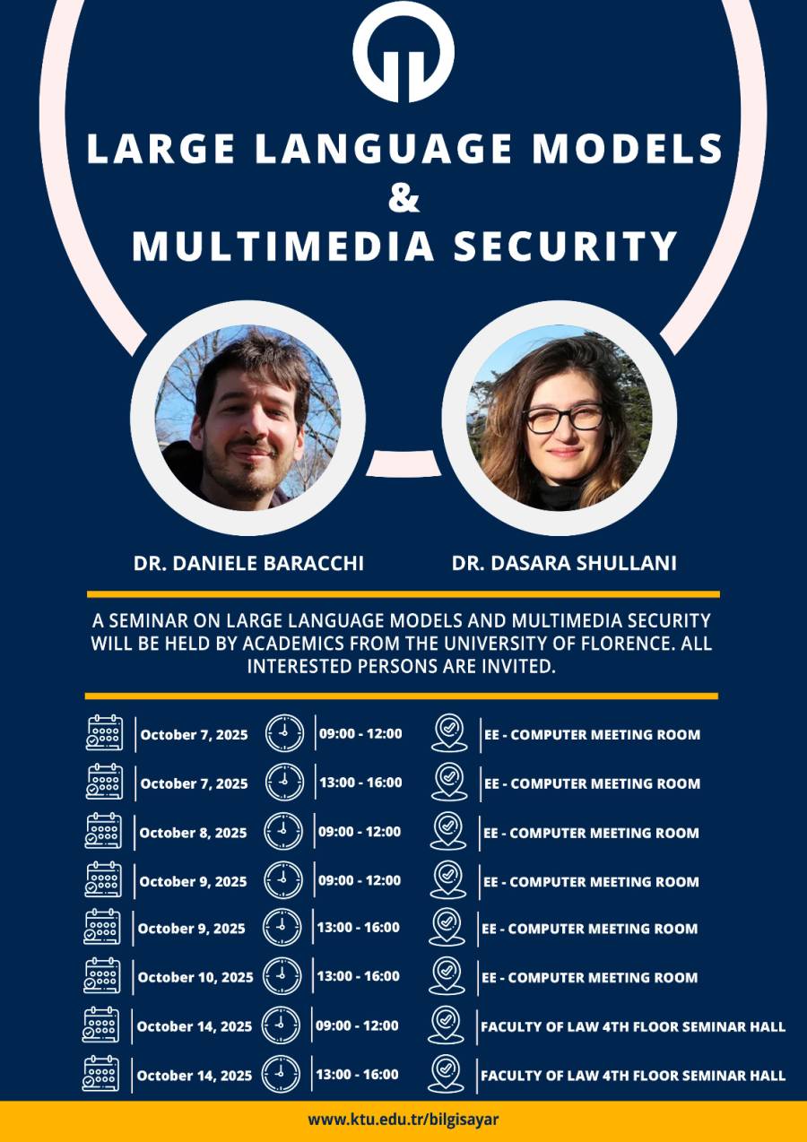 Seminerlerde, yapay zekâda büyük dil modelleri ve çoklu ortam güvenliği konularında güncel gelişmeler ele alınacak olup tüm ilgililer davetlidir.