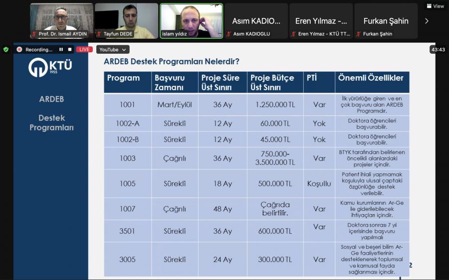 Enstitümüzde öğrenim görmekte olan lisansüstü öğrencilerimiz için 29 Aralık 2022 Perşembe Günü Saat 20:00’da ZOOM Uzaktan Toplantı Uygulaması üzerinden çevimiçi olarak "Lisansüstü Öğrenciler İçin TÜBİTAK Destekleri" başlıklı eğitim etkinliği düzenlenmiştir. KTÜ Teknoloji Transfer Uygulama ve Araştırma Merkezi’nde görev yapmakta olan Sayın Öğr. Gör. İslam YILDIZ tarafından gerçekleştirilen etkinlik içeriği, Enstitümüz öğrencilerinden gelen talepler dikkate alınarak hazırlanmıştır.