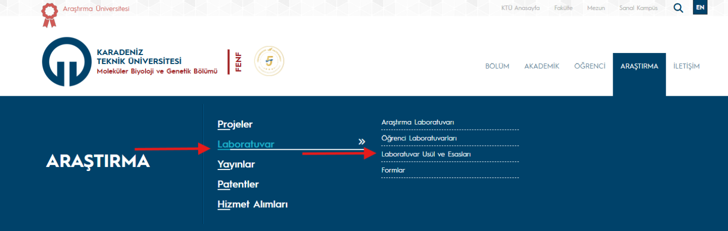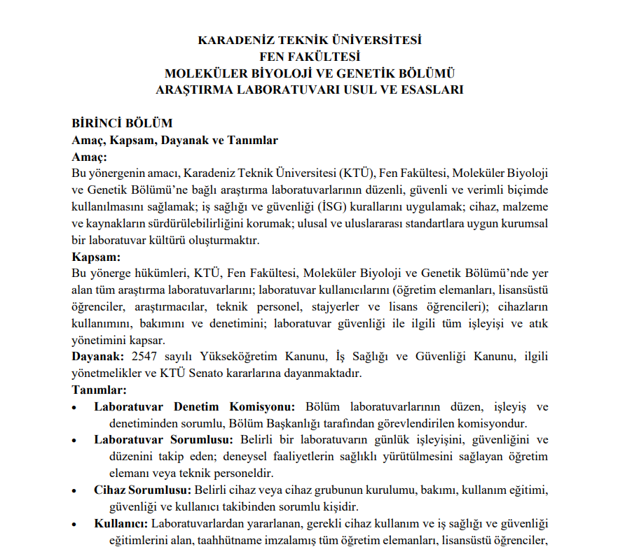 Karadeniz Teknik Üniversitesi Fen Fakültesi Moleküler Biyoloji ve Genetik Bölümü Akademik Bölüm Kurulu’nun 16.10.2025 tarihli ve 74 sayılı toplantısında alınan kararlar doğrultusunda, laboratuvar çalışmalarının düzenli, güvenli ve etkin bir şekilde yürütülmesini sağlamak amacıyla Araştırma Laboratuvarı Usul ve Esasları oluşturularak uygulamaya alınmıştır.