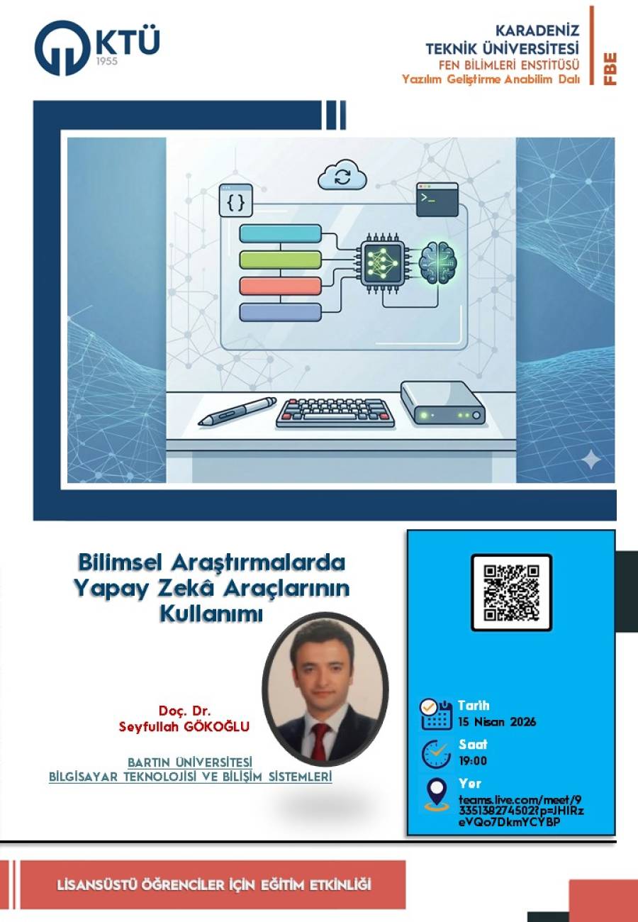 Bilimsel araştırmaların tasarımından veri analizine kadar pek çok fırsat sunan yapay zekâ araçları, akademik dünyada yeni bir dönemin kapılarını aralıyor. Bu dönüşümü yakından takip etmek ve doğru araçları etkili bir şekilde kullanabilmek adına düzenlediğimiz çevrimiçi seminerin konuğu, Bartın Üniversitesi Bilgisayar Teknolojisi ve Bilişim Sistemleri bölümünden Doç. Dr. Seyfullah Gökoğlu olacak.