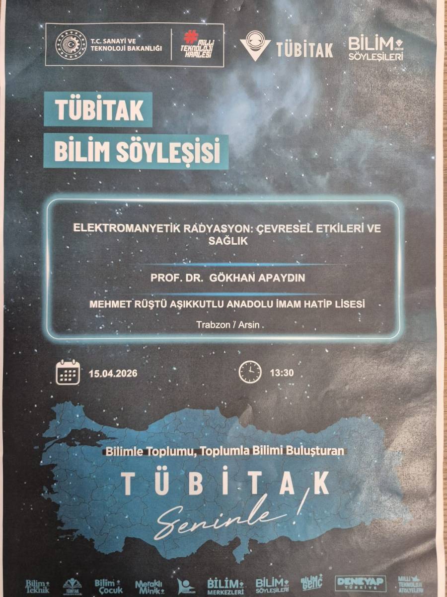 TÜBİTAK 2026 yılı Bilim Söyleşileri kapsamında Prof. Dr. Gökhan APAYDIN, Arsin Mehmet Rüştü Aşıkkutlu Anadolu İmam Hatip Lisesi öğrencileri ile bir araya geldi. Program kapsamında "Elektromanyetik Radyasyon: Çevresel Etkileri ve Sağlık" başlıklı bir sunum gerçekleştirildi. Sunumda öğrencilere; Radyasyon türleri, ölçümleri, radyasyonun insan üzerine etkileri ve radyasyondan korunma yöntemleri başlıklarında bilgilendirmeler yapıldı. Programın sonunda öğrencilerin etkinlik konusu ve fizik bilimi hakkında merak ettiği sorular cevaplandı.