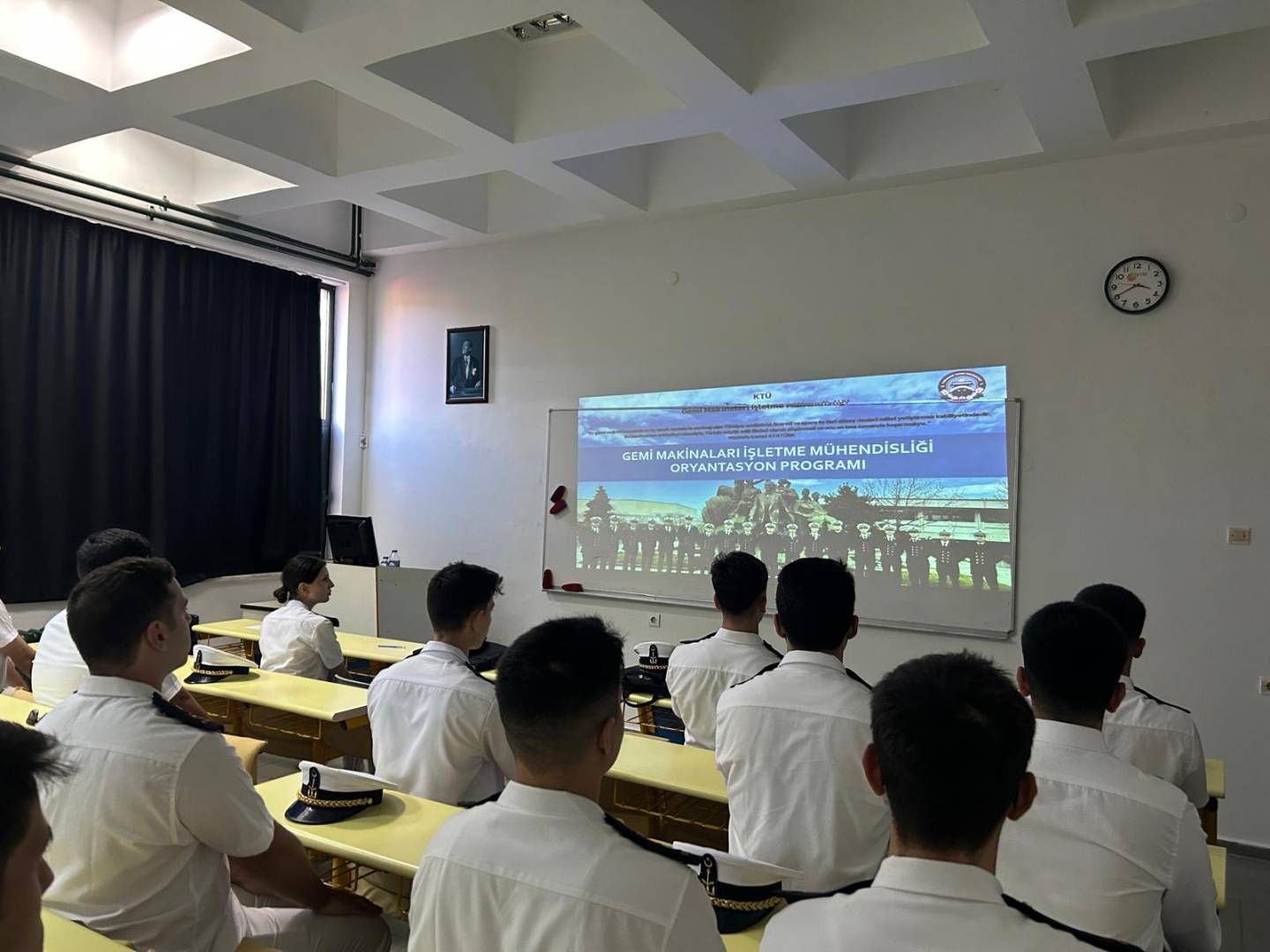 Arş. Gör. Abdülkadir Coşkun ve Arş. Gör. Aleyna Ulucutsoy tarafından yapılan oryantasyon programı kapsamında; bölüm akademik ve idari personelinin tanıtımı, ders ve staj süreçleri hakkında bilgilendirme, bölüm yerleşke bilgileri ve ulaşım imkanları aktarılmıştır. Ayrıca, bölüm içi etkinlikler ve Gemi Makineleri İşletme Mühendisliği Kulübü hakkında öğrencilerimize bilgi verilmiştir.