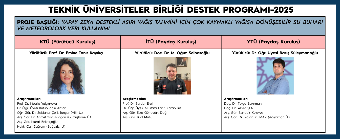 Teknik Üniversiteler Birliği tarafından bu yıl ilk defa yürütülen TU11 2025 Proje Çağrısı kapsamında 11 teknik üniversite arasından en az 3 teknik üniversiteden ortaklarla sunulmuş 50 proje başvurusu gerçekleştirilmiş; yapılan bilimsel ve teknik değerlendirme sürecinin ardından 16 projenin desteklenmesine karar verilmiştir. Teknik Üniversiteler Birliği (TU11) kapsamında başlatılan TU11 BAP İş Birliği Projeleri kapsamında Üniversitemizden 14 Araştırmacımızın sunduğu proje hakem görüşleri sonrasında TU11 komisyona sunulmuştur. Proje ortağı üniversitelerin değerlendirmeleri, ortak üniversitelerin destek verebilecekleri proje sayıları dikkate alınarak üniversitemizden sunulan 7 proje TU11 komisyonu kararıyla destek almaya hak kazanmıştır. Bu kapsamda, Bölümümüz Jeodezi Anabilim Dalı öğretim üyelerinden Prof.Dr. Emine Tanır Kayıkçı’nın yürütücülüğünü üstlendiği; İstanbul Teknik Üniversitesi ve Yıldız Teknik Üniversitesi ortaklığında hazırlanan “Yapay Zeka Destekli Aşırı Yağış Tahmini İçin Çok Kaynaklı Yağışa Dönüşebilir Su Buharı ve Meteorolojik Veri Kullanımı” başlıklı proje önerisi, yapılan değerlendirmeler sonucunda destek almaya hak kazanmıştır. Üniversiteler arası iş birliğini geliştirmek ve yüksek teknolojiye dayalı araştırmaları desteklemek üzere oluşturulmuş TU11 Proje Çağrısı kapsamında projesi desteklenmeye hak kazanan Prof.Dr. Emine Tanır Kayıkçı hocamızı, bölümümüz proje araştırmacılarını ve İTÜ ve YTÜ’den proje ortaklarımızı gönülden tebrik ediyoruz. TU11 sonuçlarıyla elde ettiğimiz bu başarı, bölümümüzün üniversiteler arası iş birliklerini güçlendirerek ulusal/uluslararası düzeyde bilimsel üretime nitelikli katkı sağlama vizyonu açısından önem taşımaktadır.