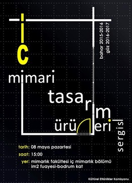 KTÜ Mimarlık Fakültesi İç Mimarlık Bölümü kültürel etkinlikleri kapsamında geleneksel olarak düzenlenen ve 08 Mayıs 2017 saat 15:00’ da açılışı yapılan İç Mimarlık Bölümü Bahar 2016-Güz 2017 dönem ders ürünlerini kapsayan İç Mimari Tasarım Ürünleri Sergisi KTÜ Mimarlık Fakültesi Erdem Aksoy Deneysel Tasarım Labaratuvarı’ nda gerçekleşmiştir. Sergi kapsamında İç Mimari Proje 1 den İç Mimari Proje 7 ‘ ye değin sonuç ürünlerinin yanı sıra İç Mekan Restorasyonu, Grafik Model Anlatım , Mobilya Tasarımı ve çeşitli seçmeli derslerin ürünlerine de yer verilmiştir. Bölüm Sergisi 08 Mayıs 2017-14 Mayıs 2017 tarihleri arasında ziyarete açık tutulmuştur.