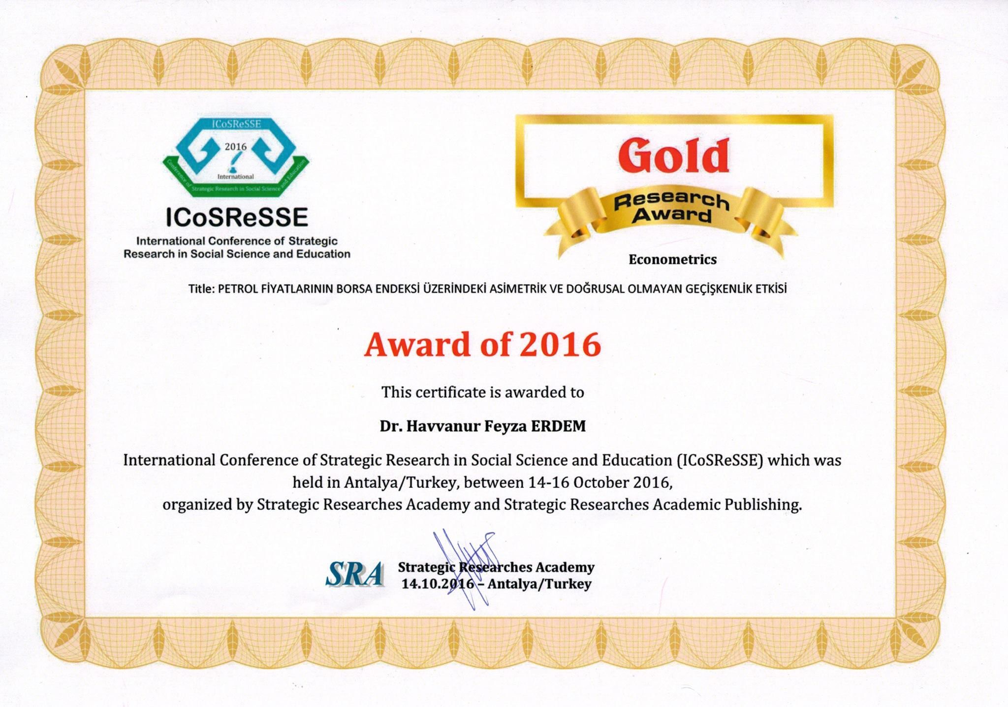 Fakültemiz Öğretim Üyesi Yrd. Doç. Dr. Havvanur Feyza ERDEM "International Conference of Strategic Research in Social Science and Education" adlı konferansta birinci olarak altın arastırma ödülü kazanmıstır.