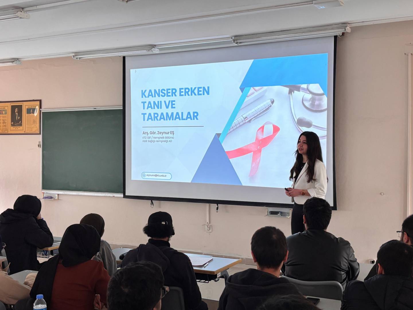 Etkinliğimizde bilgi ve deneyimlerini bizlerle paylaşan değerli konuşmacılarımız İç Hastalıkları Hemşireliği Anabilim Dalı’ndan Arş. Gör. Müge TEZEL ve Halk Sağlığı Hemşireliği Anabilim Dalı’ndan Arş. Gör. Zeynur EŞ’e ayrıca teşekkür ederiz. Kendilerinin aktardığı kıymetli bilgiler, erken tanının önemi ve kanserle mücadelede farkındalık oluşturulması açısından katılımcılar için son derece yol gösterici olmuştur.