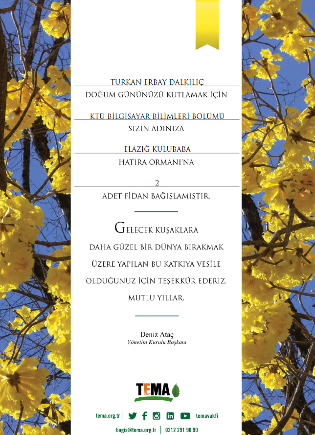 Bu etkinlik kapsamında, doğum günü vesilesiyle gerçekleştirilen geleneksel ikram organizasyonları yerine, kaynak israfının önlenmesi ve çevresel sürdürülebilirliğe katkı sağlanması amacıyla TEMA Vakfı aracılığıyla fidan bağışı yapılması tercih edilmiştir. Bu doğrultuda, bölümümüz çalışanlarından Prof. Dr. Türkan ERBAY DALKILIÇ adına Elazığ Kulubaba Hatıra Ormanı’na 2 adet fidan bağışı gerçekleştirilmiştir.