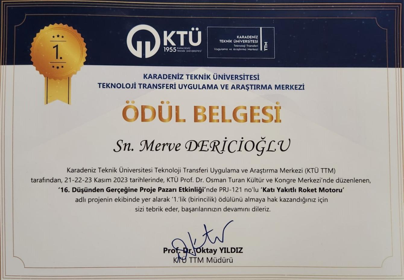 Fakültemiz İstatistik ve Bilgisayar Bilimleri Bölümü öğrencisi Merve DERİCİOĞLU, Karadeniz Teknik Üniversitesi Teknoloji Transferi Uygulama ve Araştırma Merkezi (KTÜ TTM) tarafından düzenlenen 16. Düşünden Gerçeğine Proje Pazarı Etkinliği’nde “Katı Yakıtlı Roket Motoru” adlı proje ile 1. lik ödülünü kazanmıştır.