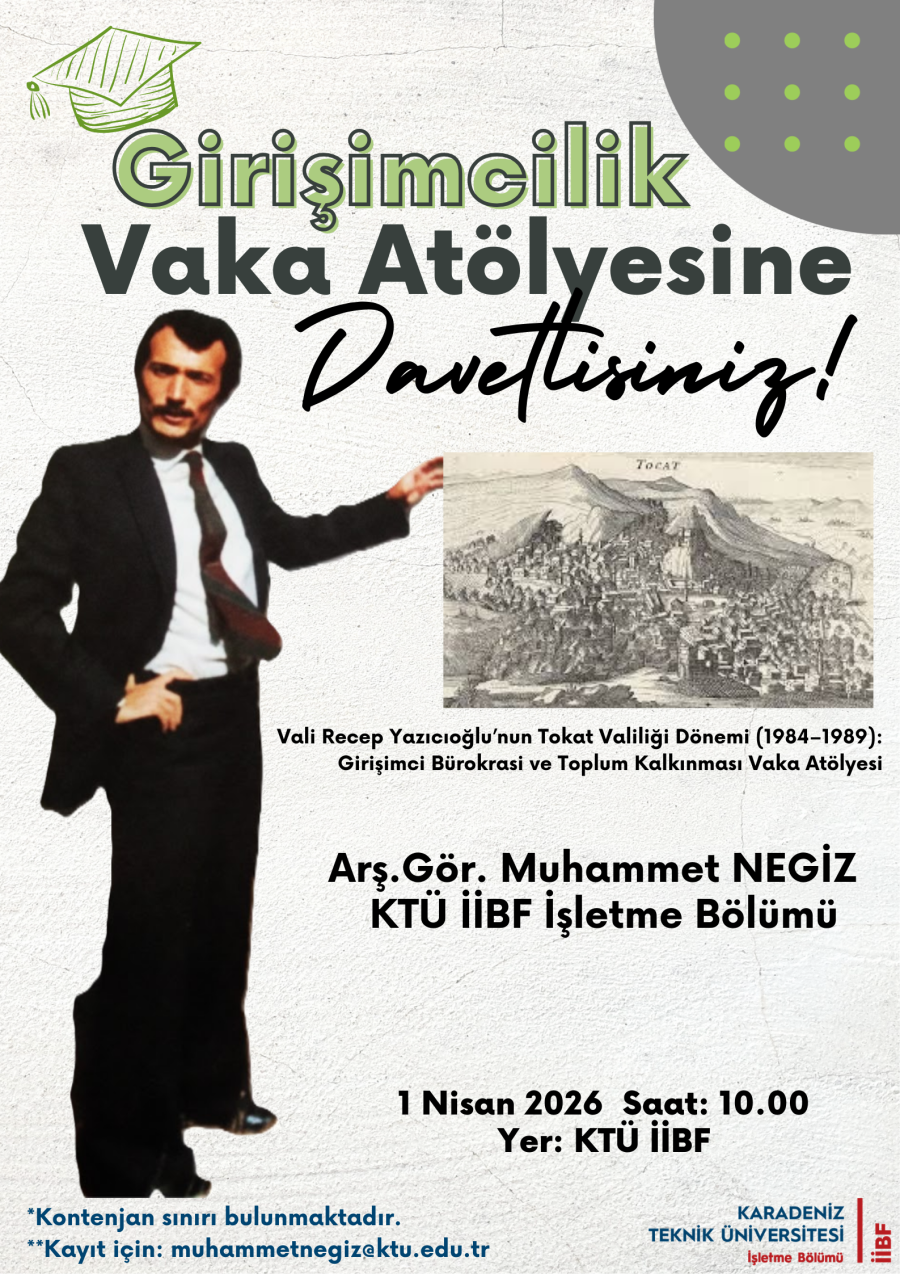 Vali Recep Yazıcıoğlu’nun Tokat Valiliği Dönemi (1984–1989): Girişimci Bürokrasi ve Toplum Kalkınması Vaka Atölyesine katılmak için KTÜ İşletme Bölümü araştırma görevlisi Muhammet Negiz'e kaydınızı yaptırmanız gerekmektedir.