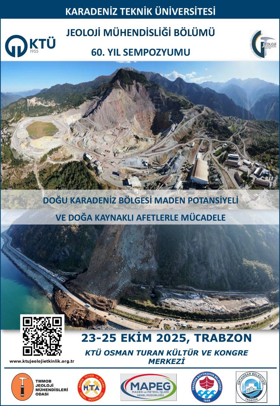 KTÜ Jeoloji Mühendisliği Bölümü'nün kuruluşunun 60. yılı anısına düzenlenen "KTÜ Jeoloji Mühendisliği Bölümü 60. Yıl Sempozyumu: Doğu Karadeniz Bölgesi Maden Potansiyeli ve Doğal Afetlerle Mücadele", 23 - 25 Ekim 2025 tarihleri arasında KTÜ Osman Turan Kültür ve Kongre Merkezi'nde düzenlenecektir. Etkinlik hakkında daha fazla bilgi için sempozyum web sitesini adresini ziyaret edebilirsiniz.