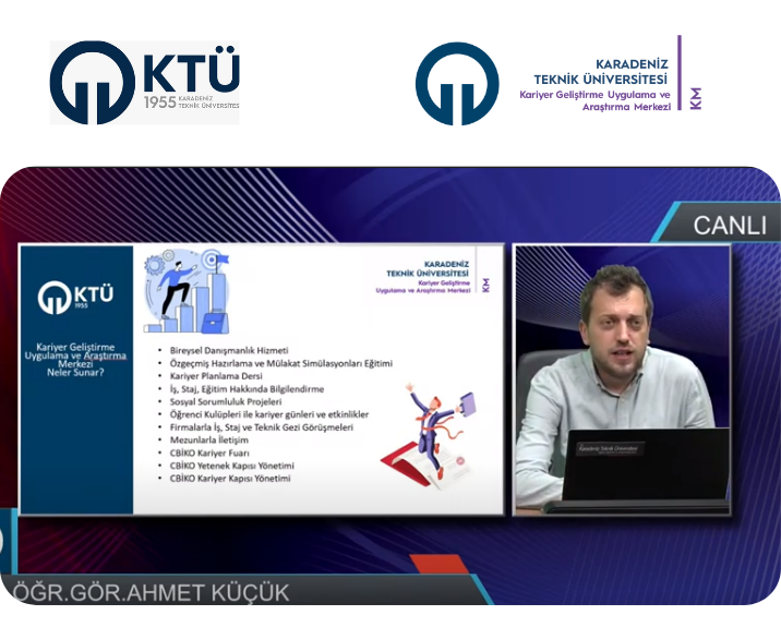 KTÜ Kariyer Geliştirme Uygulama ve Araştırma Merkezi (KM) Müdür Yrd. Öğr. Gör. Ahmet KÜÇÜK Oryantasyon Programı dahilinde 21 Eylül 2022 tarihinde KTÜ TV’ye konuk oldu. KM Müdür Yrd. Öğr. Gör. Ahmet KÜÇÜK KM bünyesinde gerçekleştirilen Bireysel Danışmanlık hizmeti, Özgeçmiş Hazırlama ve Mülakat Simülasyonları eğitimi, Kariyer Planlama dersi, Sosyal Sorumluluk projeleri, öğrenci kulüpleri ile kariyer günleri ve etkinlikleri, firmalarla iş, staj ve teknik gezi görüşmeleri, mezunlarla iletişim, CBİKO Kariyer Fuarı, CBİKO Yetenek Kapısı yönetimi, CBİKO Kariyer Kapısı yönetimi, iş, staj, eğitim hakkında bilgilendirmelerde bulundu. YouTube kanalından canlı yayınlanan program izleyicilerden gelen soruların cevaplanmasıyla sonlandırıldı.